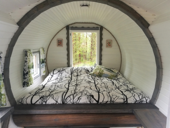 Vanha saunatynnyri koki muodonmuutoksen ja palvelee majoittujia kesäaikaan viehättävänä unitynnyrinä.